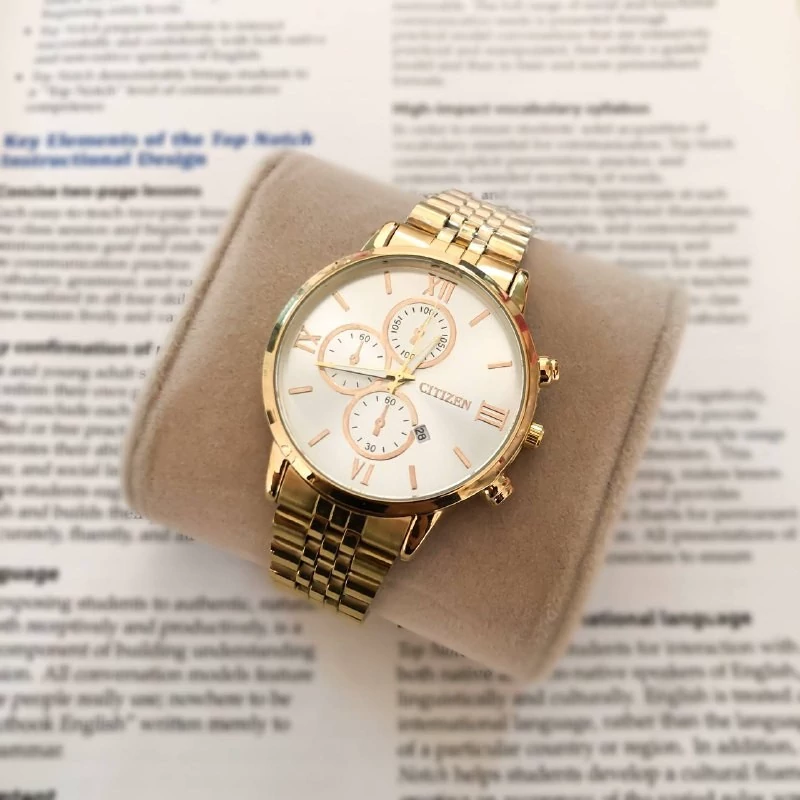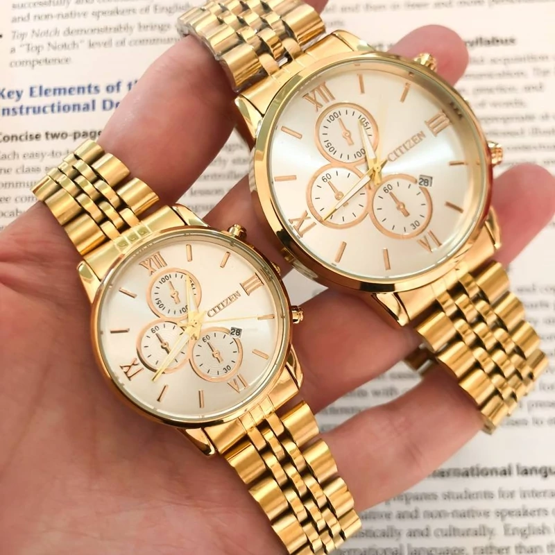 ست ساعت زنانه و مردانه مارک سیتیزن بندطلایی صفحه سفید. طرح سه موتوره