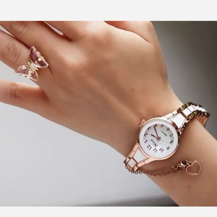 ساعت زنانه یا دخترانه بند سرامیکی همراه با آویز ساعت و انگشتر پروانه
