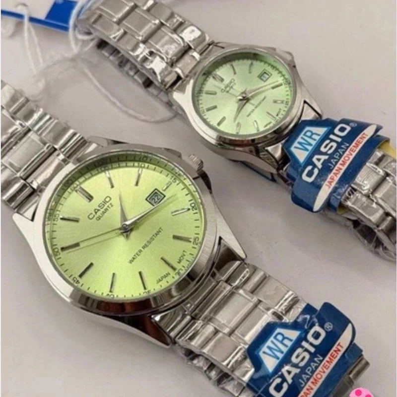 ساعت مچی ست زنانه و مردانه کاسیو نقره ای صفحه سبز روشن