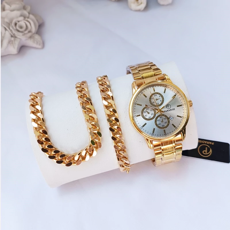 ساعت مچی مردانه طلایی دستبند گردنبند ست کامل